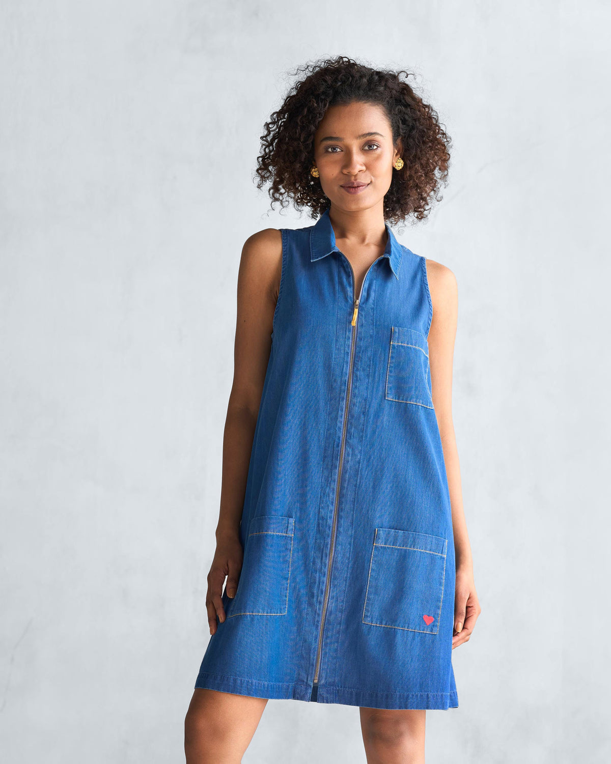 - Polished and easy, this enzyme-washed 100% cotton denim dress is elevated by the Nico heart embroidered on the pocket, a classic collar, and a brass metal zipper.