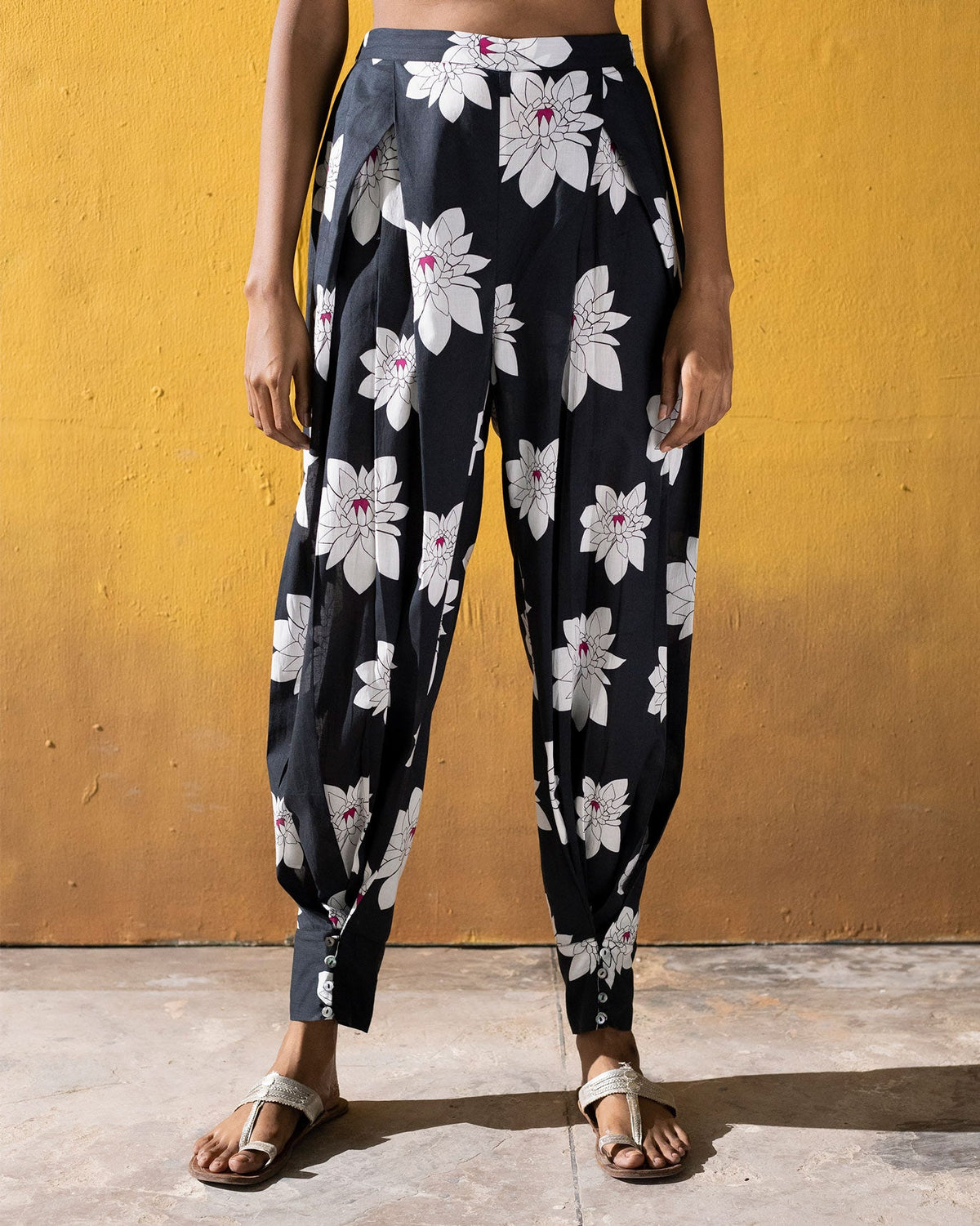 • A classic with a twist, our 100% cotton voile Jodhpurs are easy-fitting trousers which feature a bold lotus print pattern