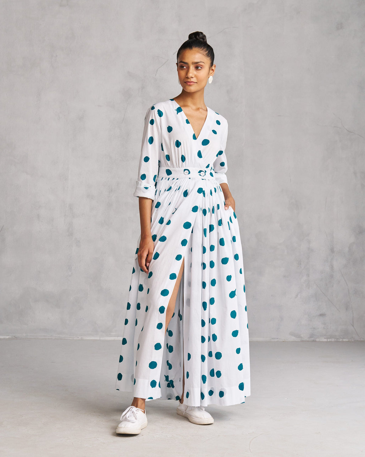• A style that's become our signature, this is an ankle-grazing wrap dress featuring a white and teal polka print.