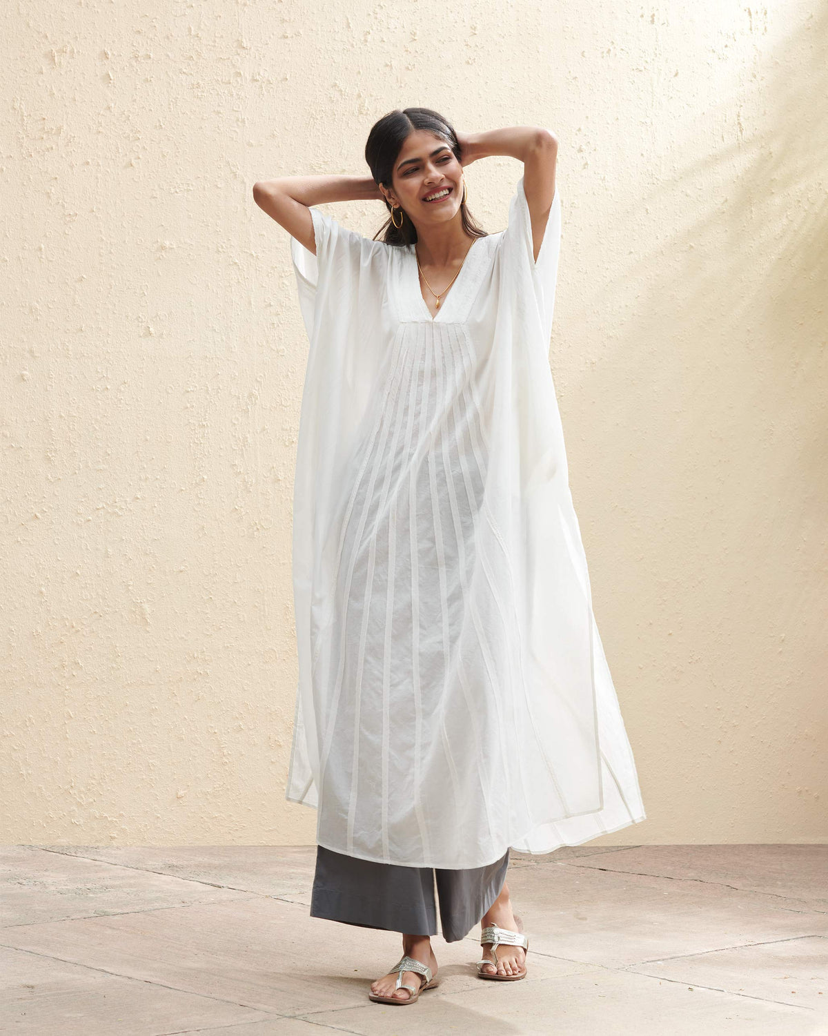 - Our calf-grazing cotton kaftan features a v-neck with panels flowing down the front, and a little flourish with frayed edges at the neck, sleeves, and panels.