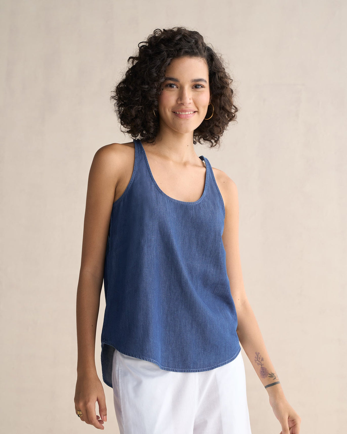 - A relaxed fitting racerback tank crafted in lightweight denim