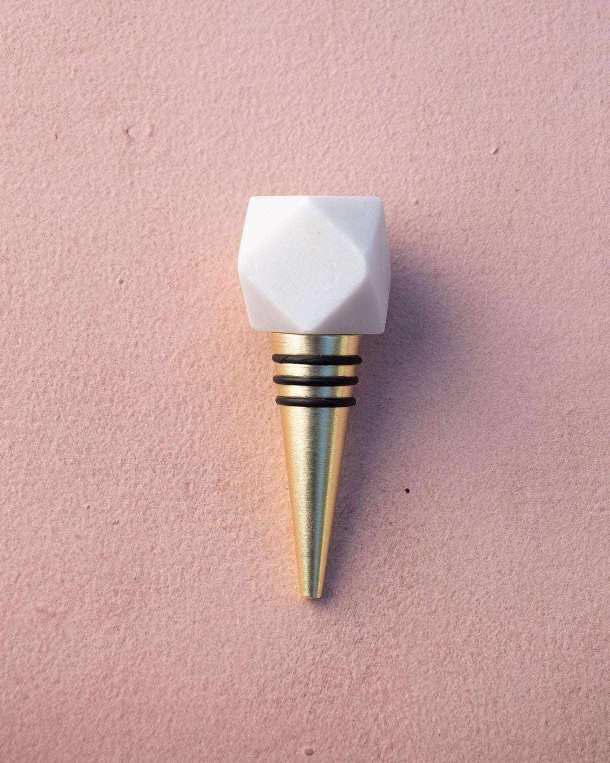 • An accessory for your bar cabinet, this bottle stopper features a white marble sphere on a body of sturdy brass-coated aluminium.