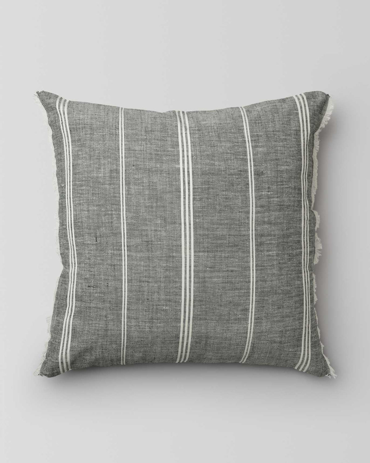 - This predominantly black cushion is punctuated with white stripes and a frayed edging