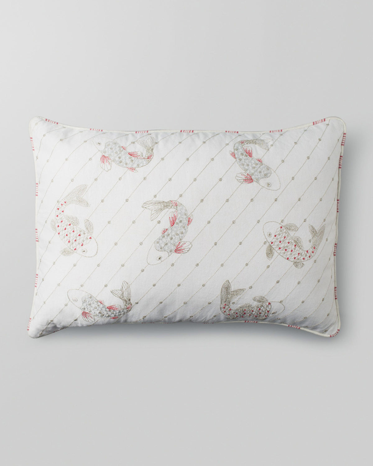 - Embroidered Koi Fish sit pretty on this ivory pillow cover, and feature the merest whisper of red alongside silver embroidery