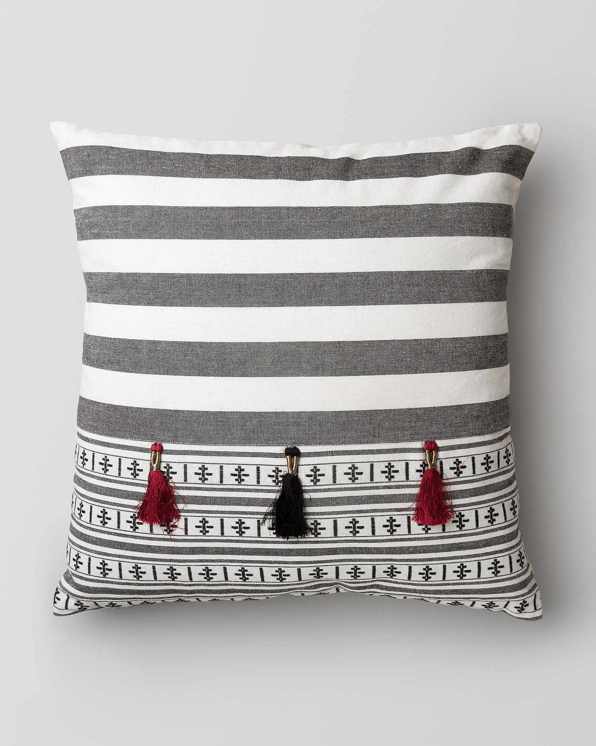 - Bold black and white stripes alongside rows of geometric print grace this cushion
