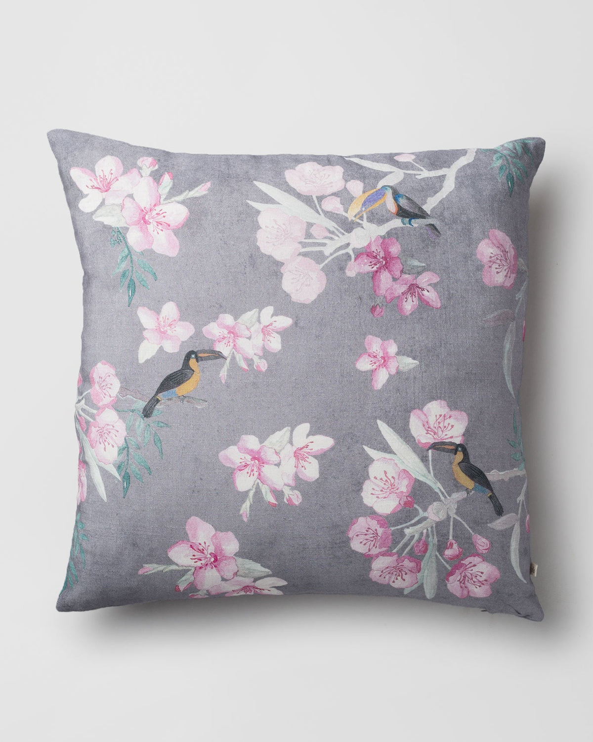 - The gauzy handfeel of tussar meets lush foliage, cherry blossoms and the odd toucan in watercolour-like patterns on our Nakano cushion in muted grey