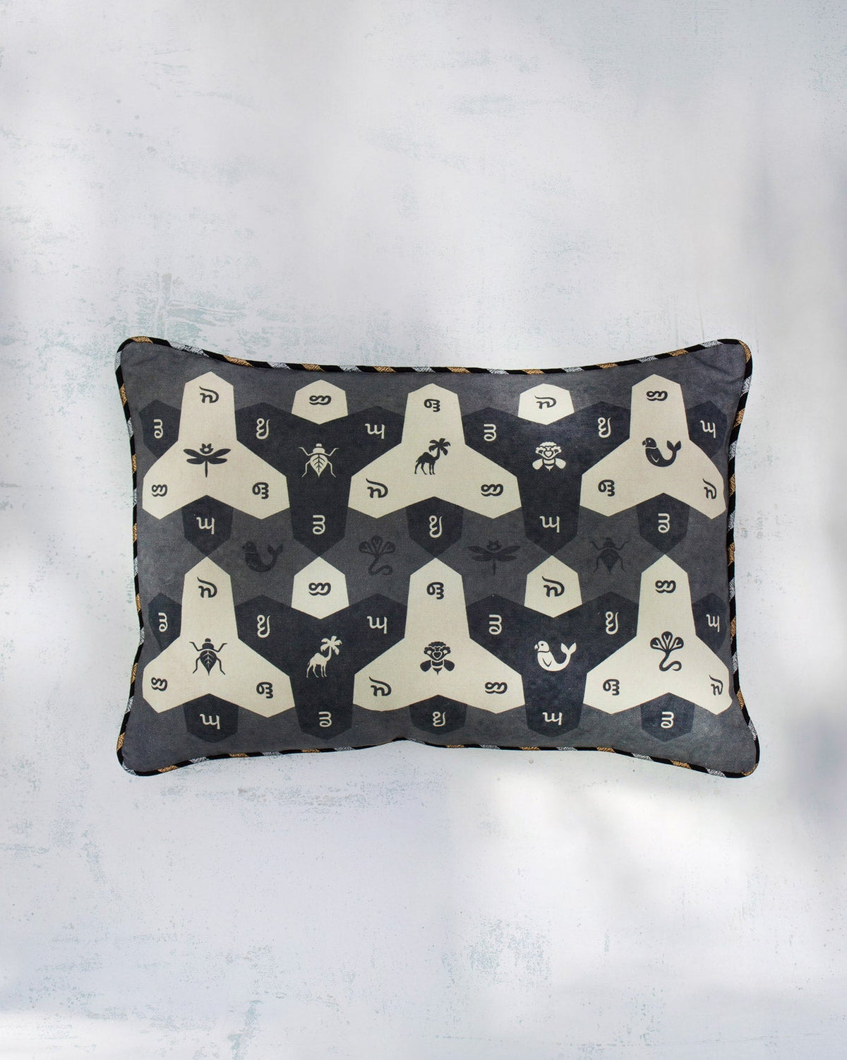 - A charcoal & ivory digi printed cushion cover with gold & silver piping around the corners