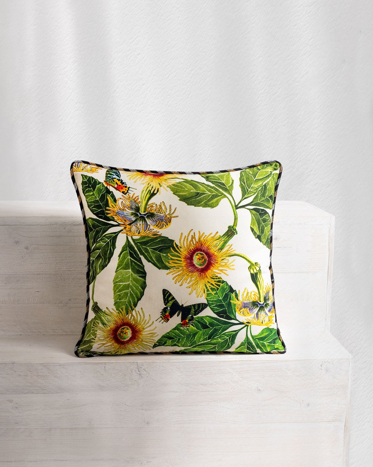 - Our Telfairia Cushion in cotton duck features the tropical vine Telfairia occidentalis and butterflies digi printed on the front and back