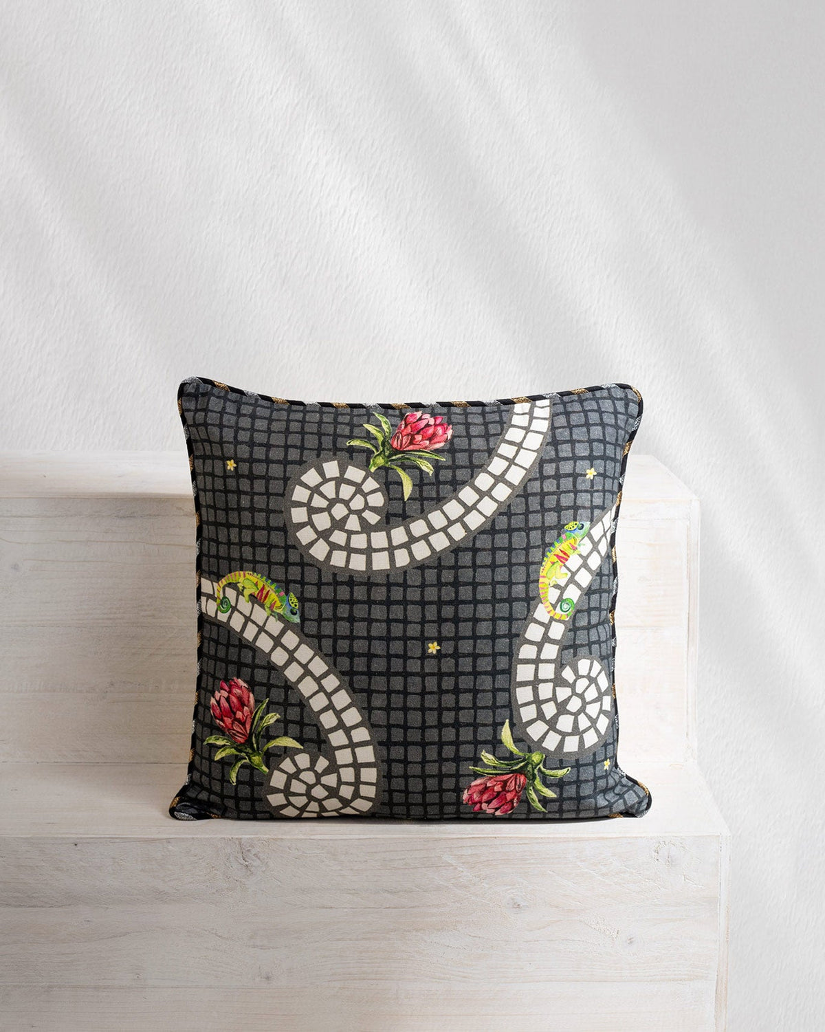- Inspired by the indigenious flora and fauna of Madagascar, our cushion features a candy stripe cord piping around the edges