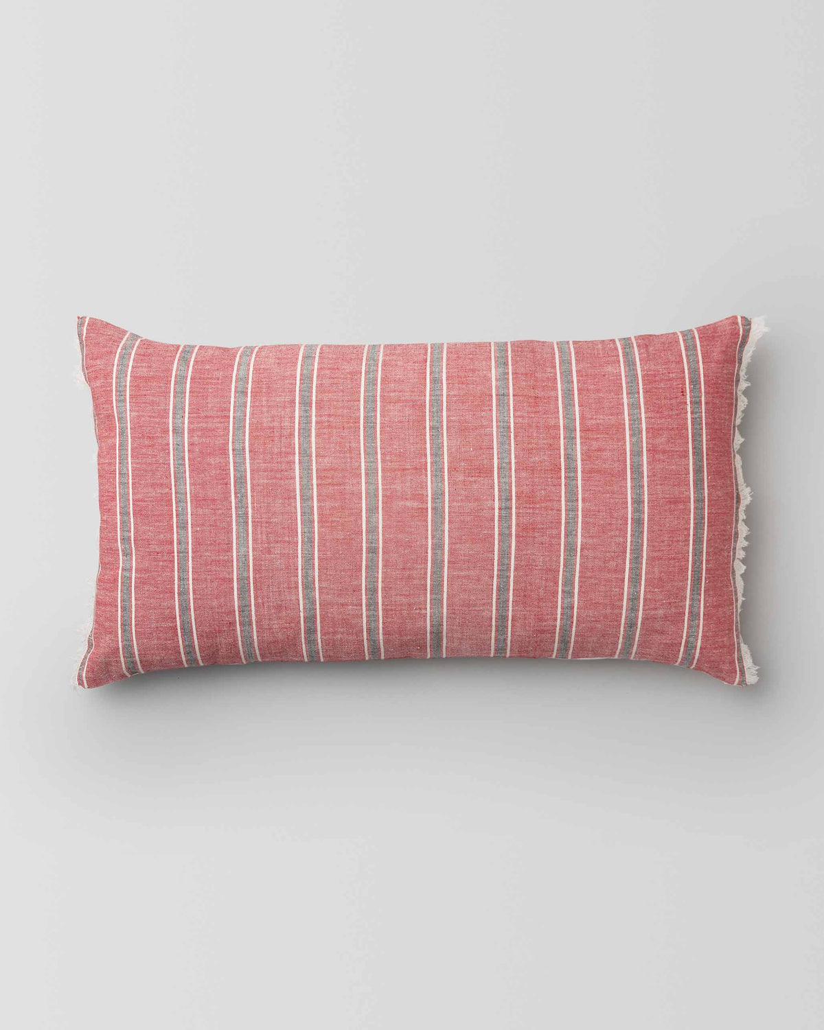 - A play of red, white and charcoal, this striped cushion features frayed edges and an ivory casement with tie closures