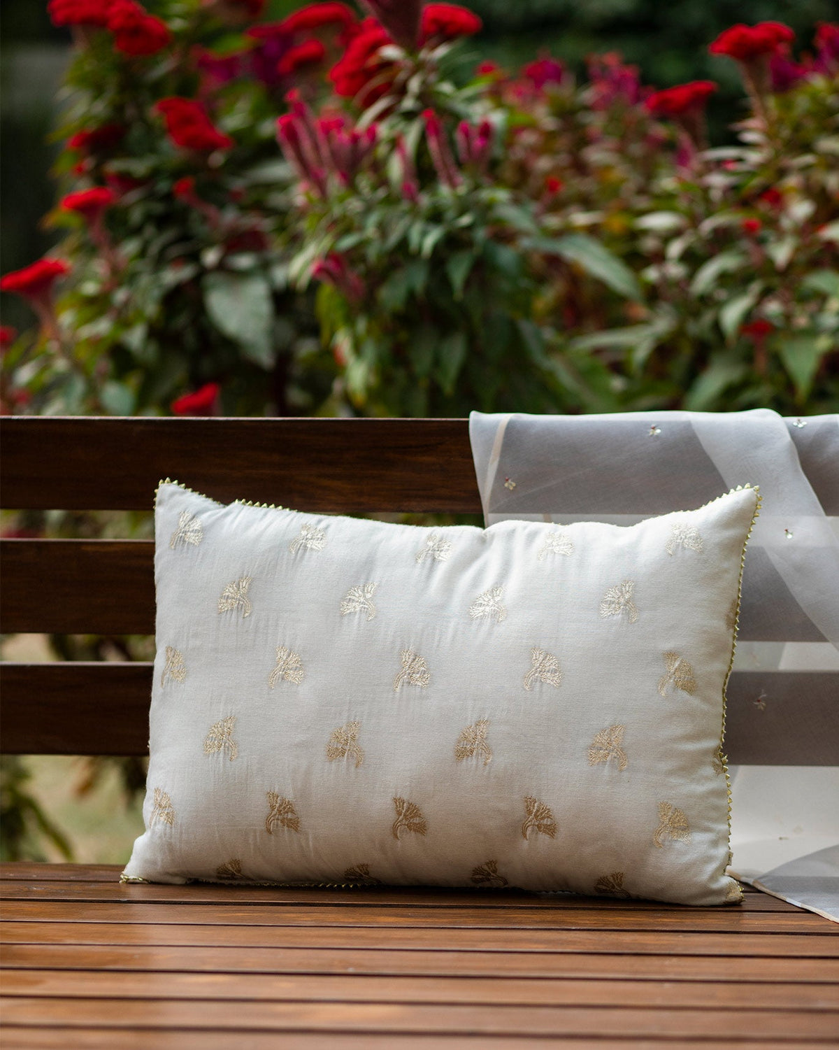 - In buttery chanderi, this cushion cover is all festive chic with a woven gold zari print and a strip of little gota triangles along the edges.