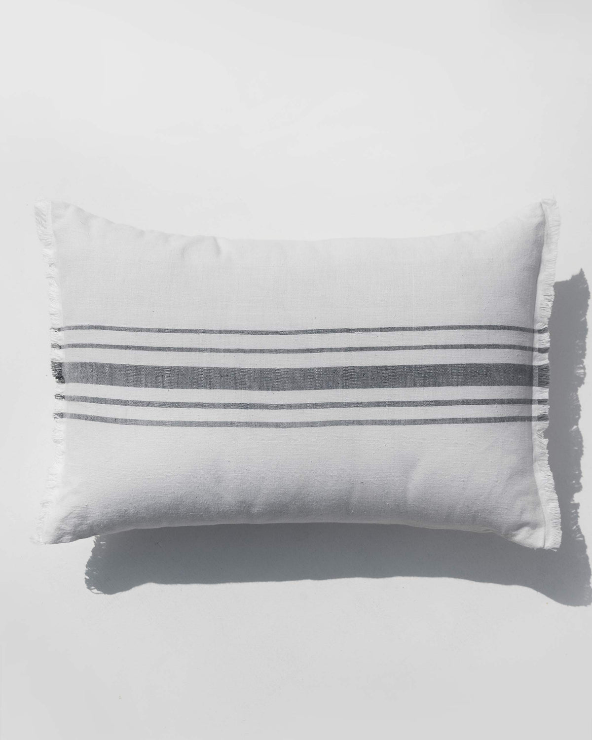 • A play of soft grey and white, this cushion features our favourite stripe, frayed edges and an envelope enclosure with ties