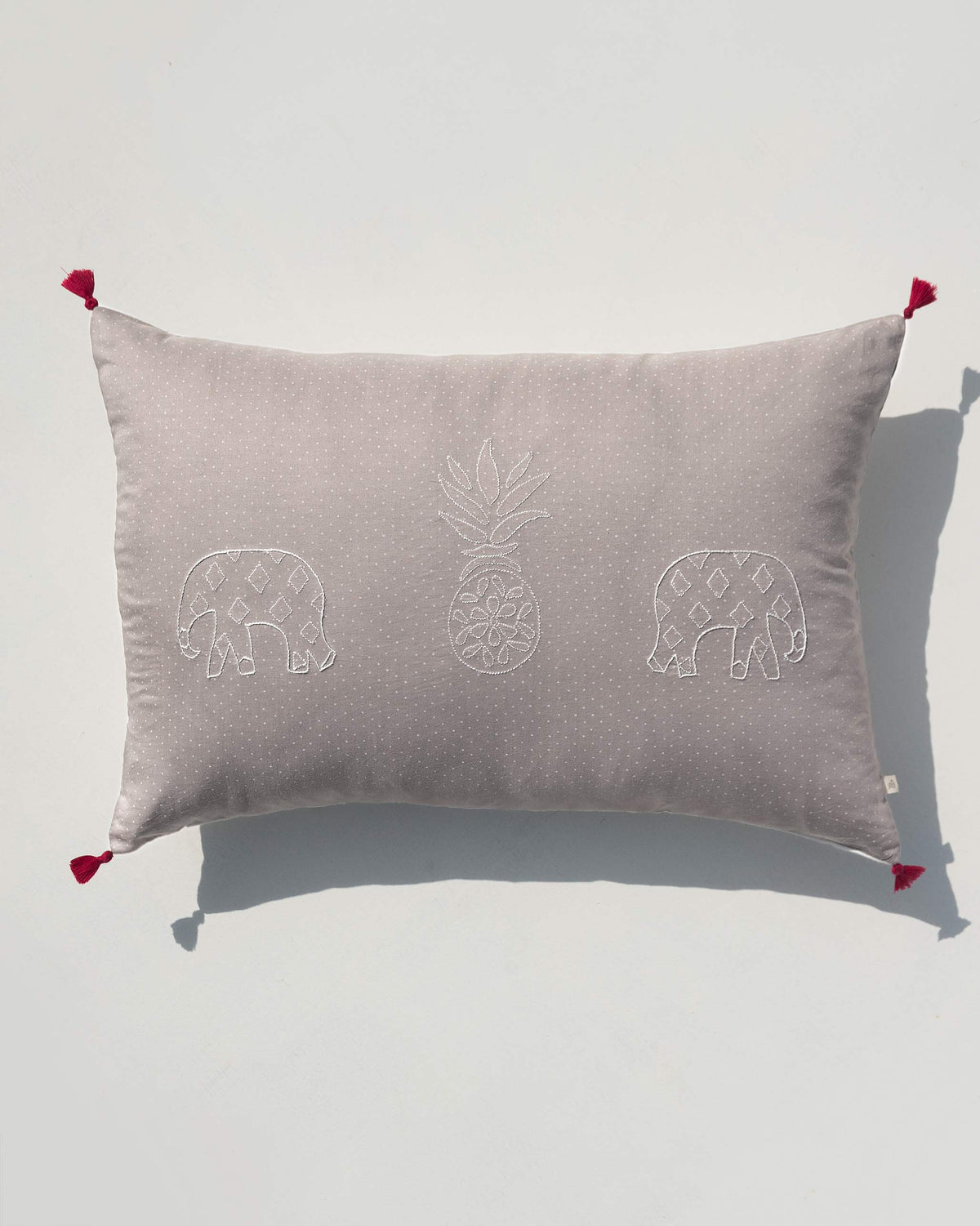 • On printed grey cotton voile, this deliciously soft cushion cover features artful hand embroidered chikankari with motifs of elephants and a pineapple as an ode to the tropics