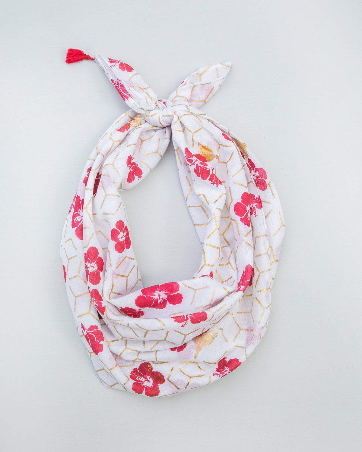 - This screen-printed scarf comes adorned with motifs of hibiscus and stupas