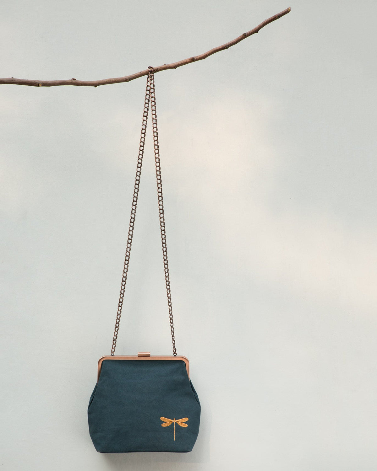 - Featuring a copper finish, it comes fitted with a chain strap and embroidered with a lovely little dragonfly.