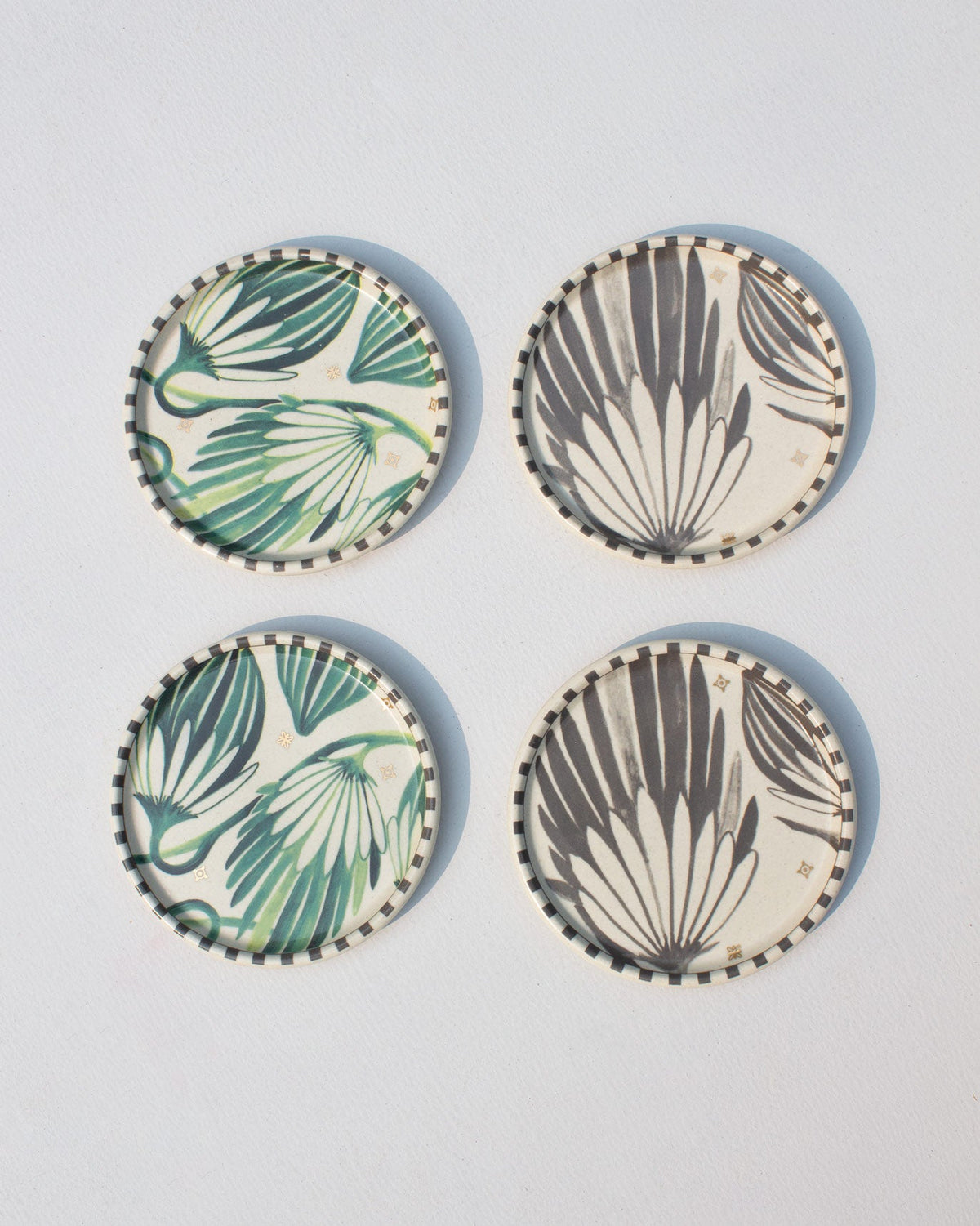 - A set of four coasters featuring lush green palms-the perfect bar accessory for drinks of all sorts.