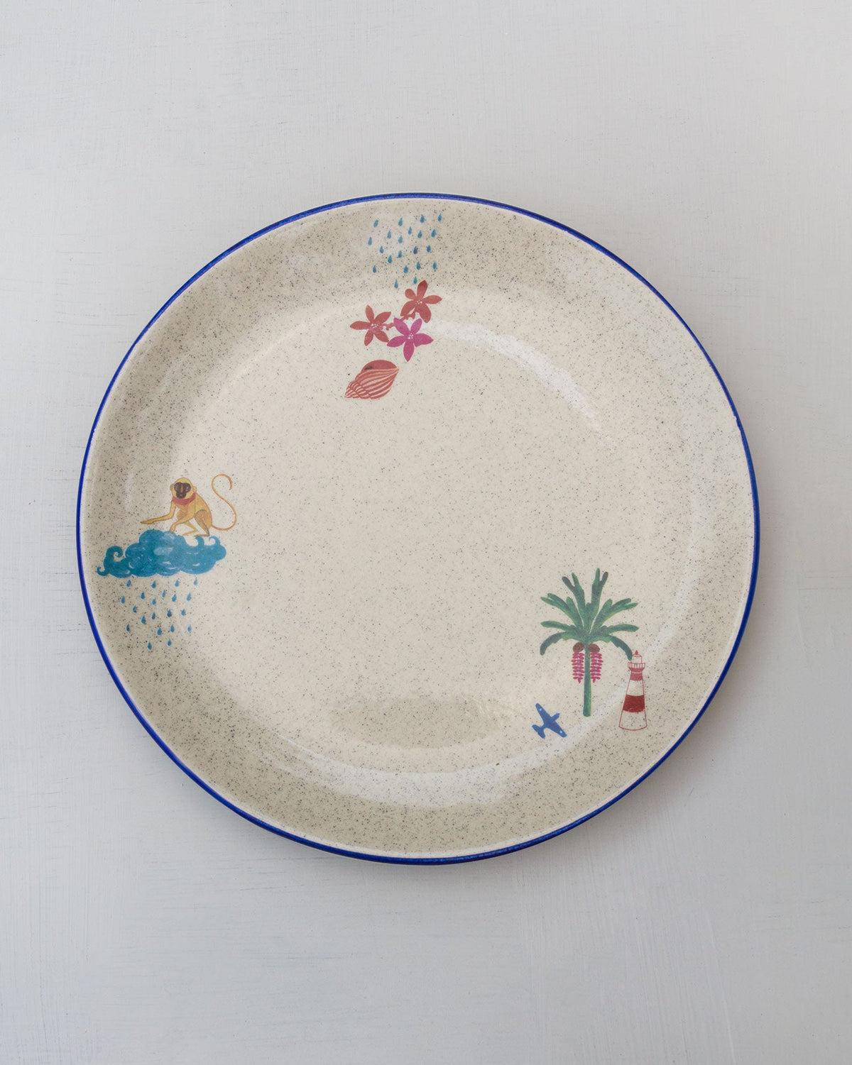 - Peppered with motifs indigenous to the Nicobar islands and crafted in glazed stoneware, this blue-rimmed dinner plate will add a touch of whimsy to your place setting.