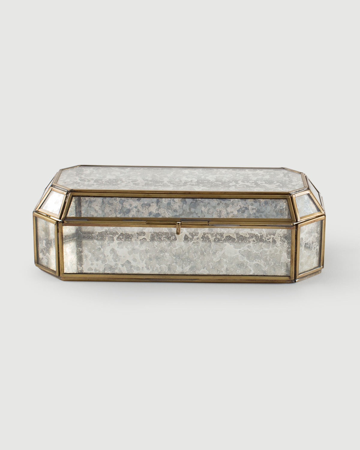 - The Cinnabar jewellery box is made of antique finish glass and features an inlaid mirror and brass accents, for a chic look with a classic feel.