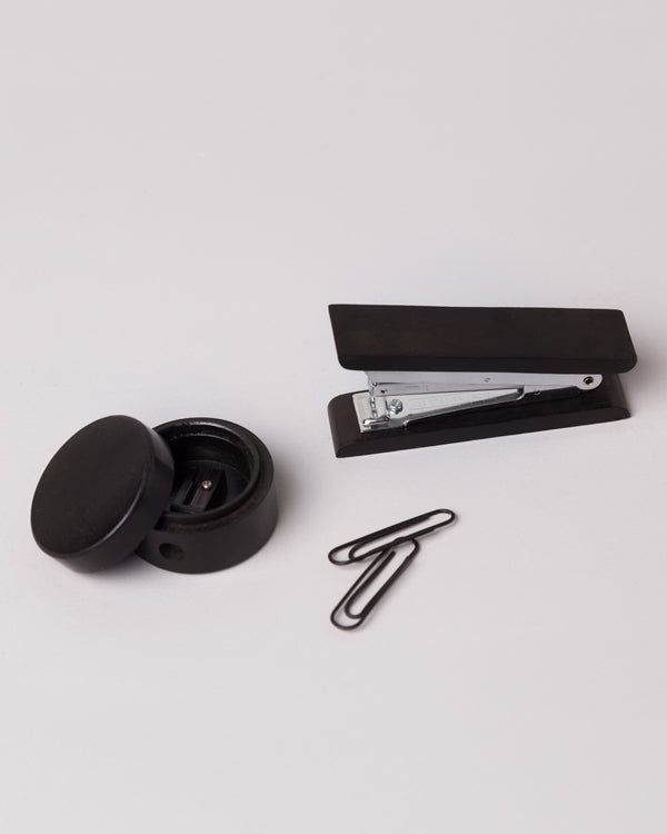 - Handy set for when you're met with a day's work, this set comes with a set of 25 U clips, a sharpener and a stapler, all in raven wood.