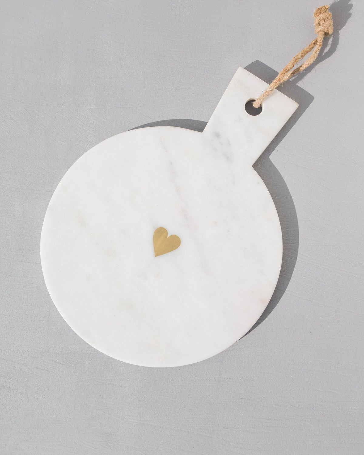 - Smooth, white marble with a wooden base and a heart-shaped brass inlay- our cheeseboard looks as delicious as the cheese it holds.