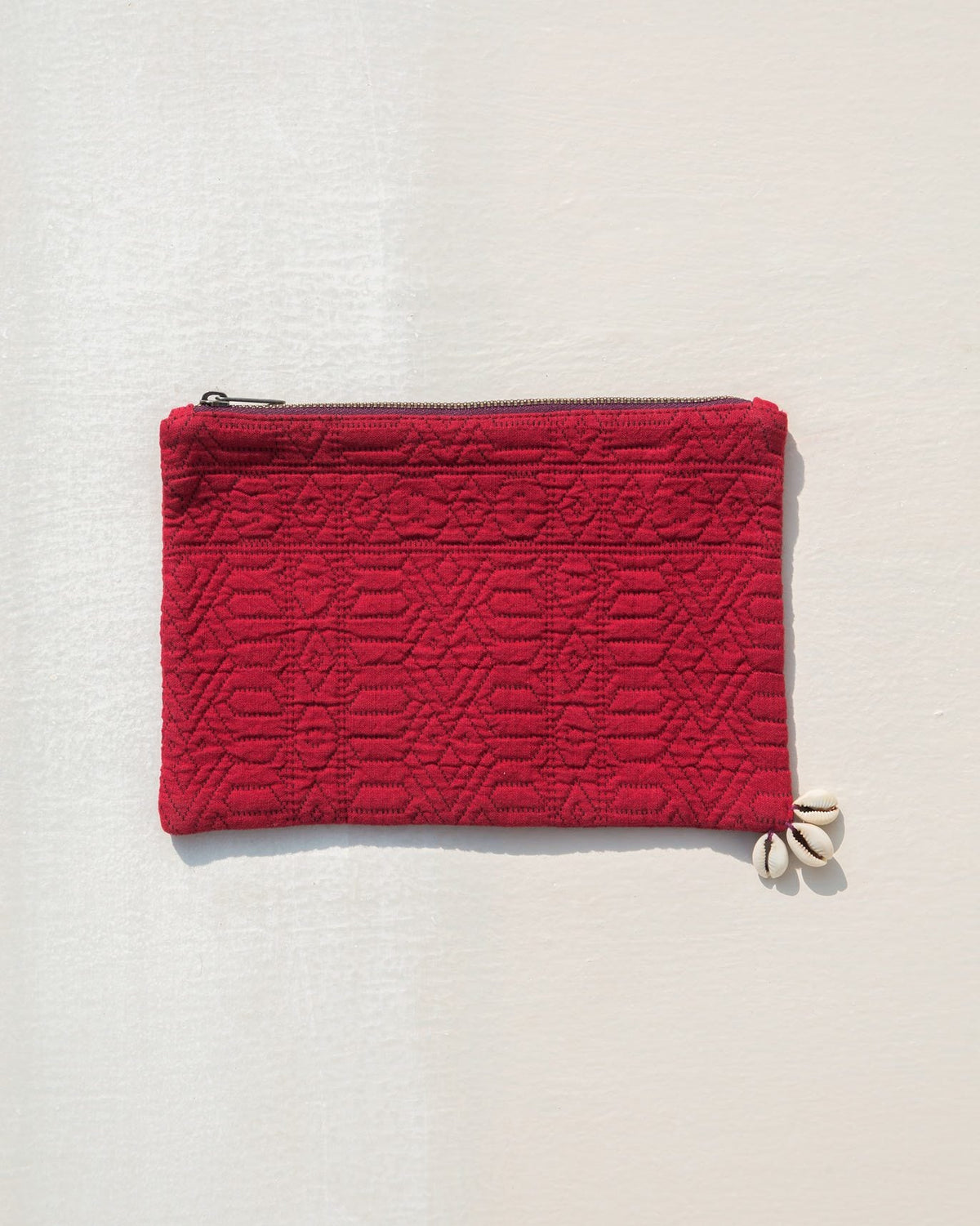 - Great for gifting, our medium-sized pochette features a quilted ruby exterior and a smart metal zipper edged in cowri tassels