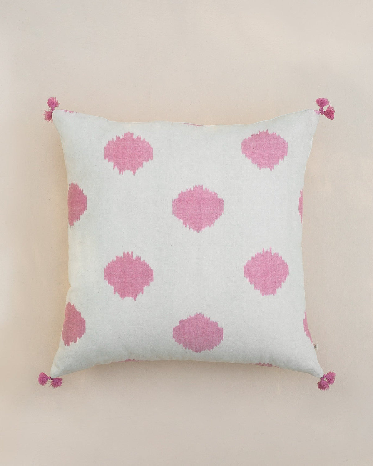 - Inspired by the colours worn by the Banjara women juxtaposed against the desert sand, this is a woven polka cushion with two pink pom-poms at the corners