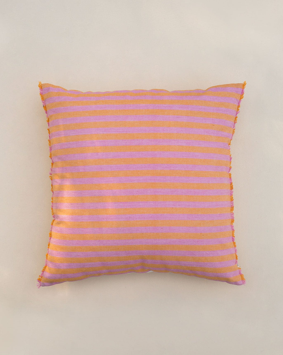 • Inspired by the colours worn by the Banjara women juxtaposed against the desert sand, this is a pink and orange stripe cushion with an envelope enclosure and ties