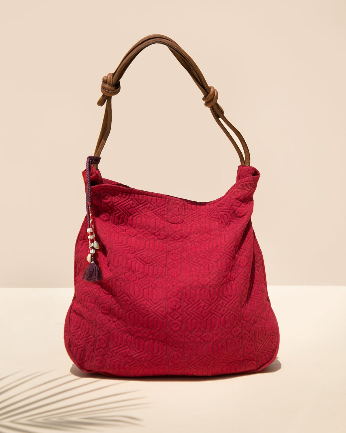 - In bright red, this handy tote has a PU cord handle, an adjustable tassel, and a gunmetal snap button.