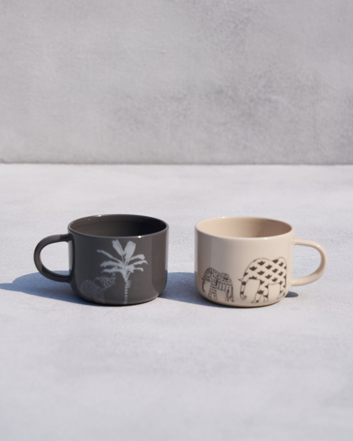 • Set of two mugs crafted in glazed stoneware featuring our iconic coastal palm and elephant motif