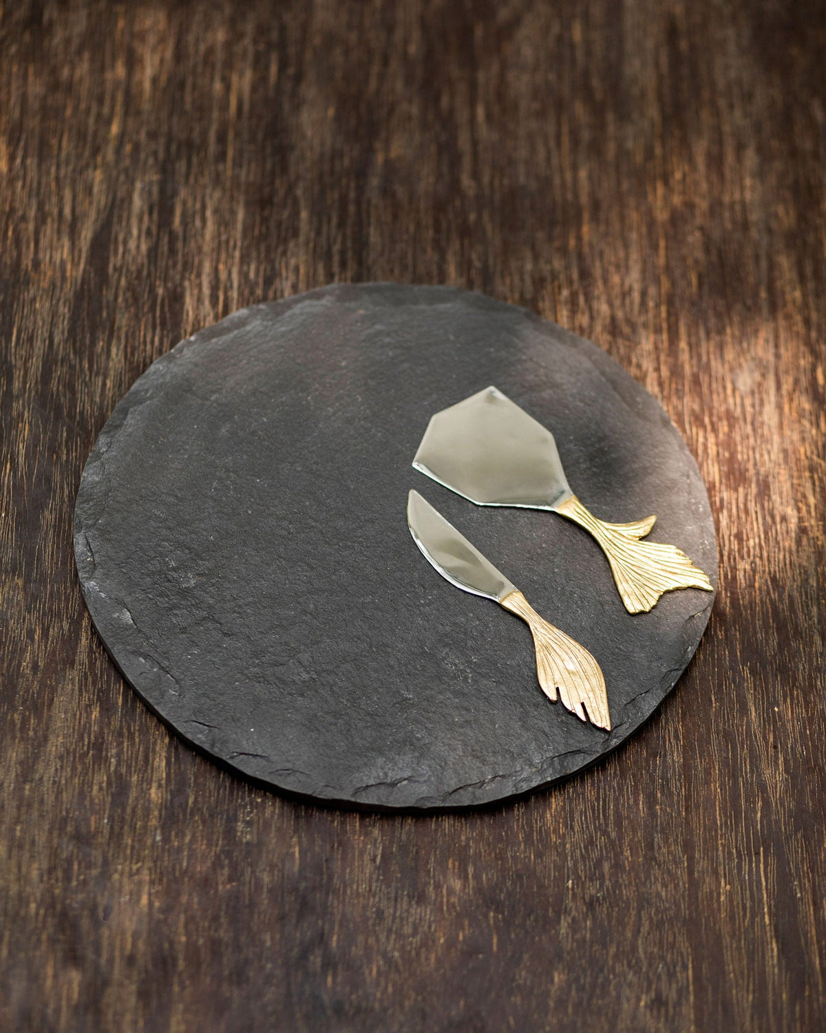 - A striking duo of black slate and twinkling knives in stainless steel + brass
