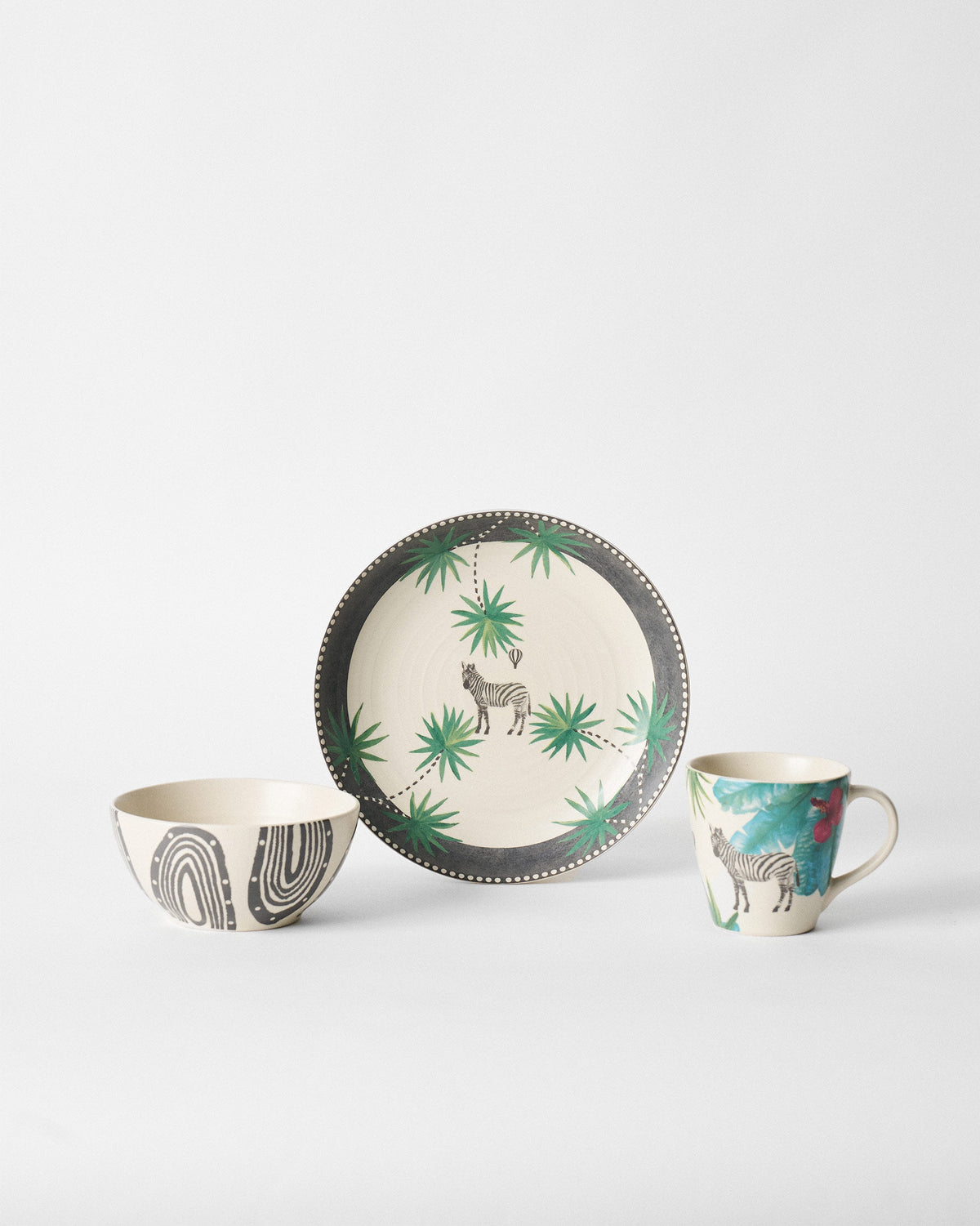 • The set includes a cereal bowl, conical bowl, and pasta plate—each crafted in sturdy stoneware and detailed with traditional motifs from our travels, including the signature zebra against a backdrop of lush flora and fauna.
