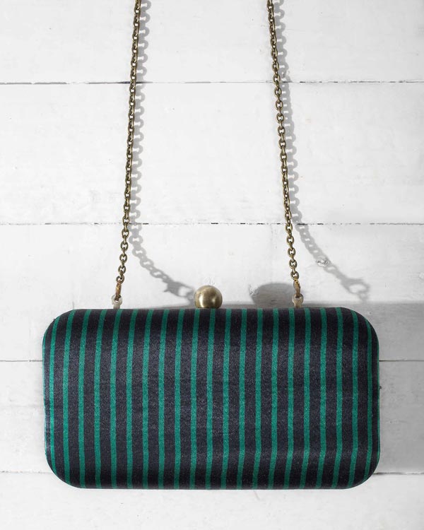- Smooth mashru in emerald green and black stripes makes a classic box clutch perfect for an evening out
