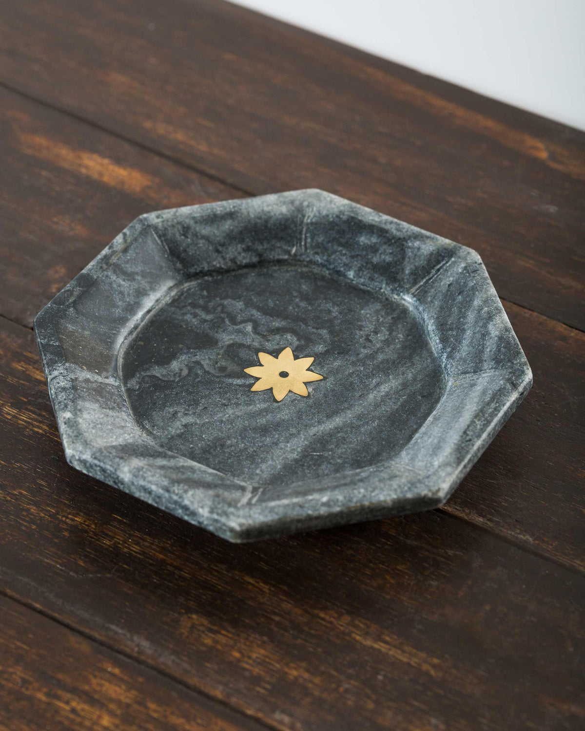 - This hexagonal tray comes in a smooth deep charcoal marble with a gold flower motif in the centre