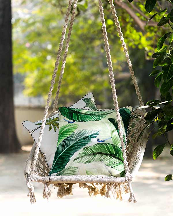 - Which is why our cushion features an abundance of banana leaves and little blue birds