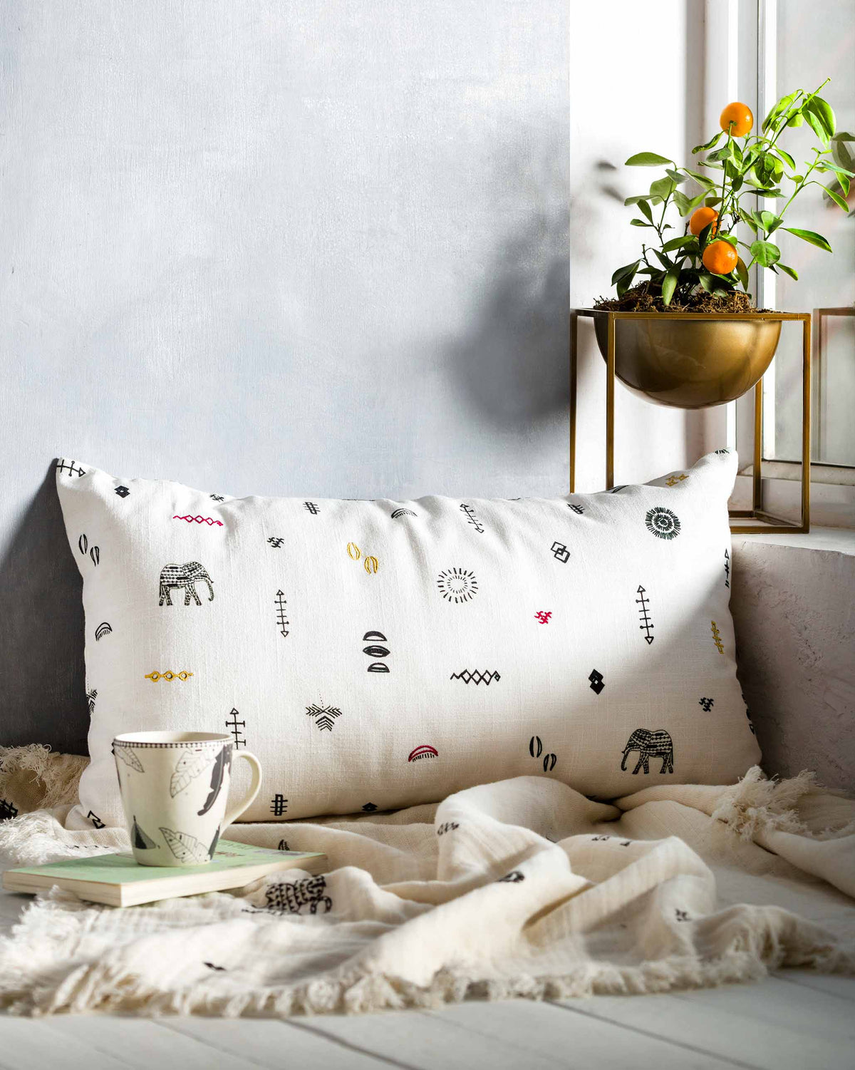 • Peppered with tribal motifs, wild elephants and celestial bodies sit on this ivory cotton cushion