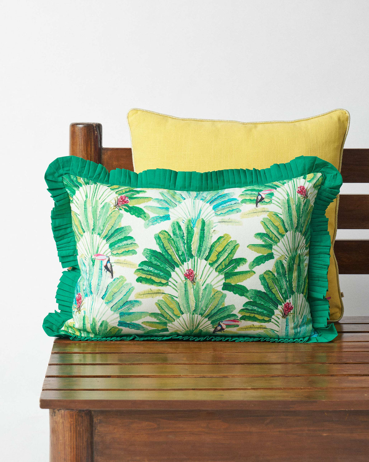 • A playful scatter of toucans perches across banana leaves in the Toucan Lush Cushion Cover that features a bold, leafy jungle print.