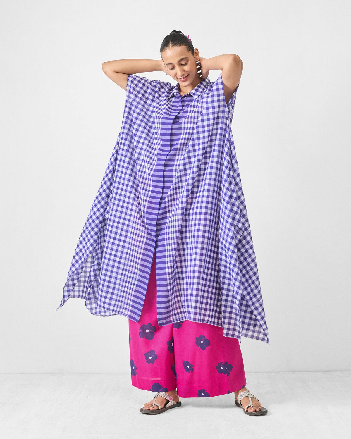 - Crafted in 100% yarn-dyed cotton, the uneven purple and white checks bring a soft, textured rhythm to this freesize silhouette.
