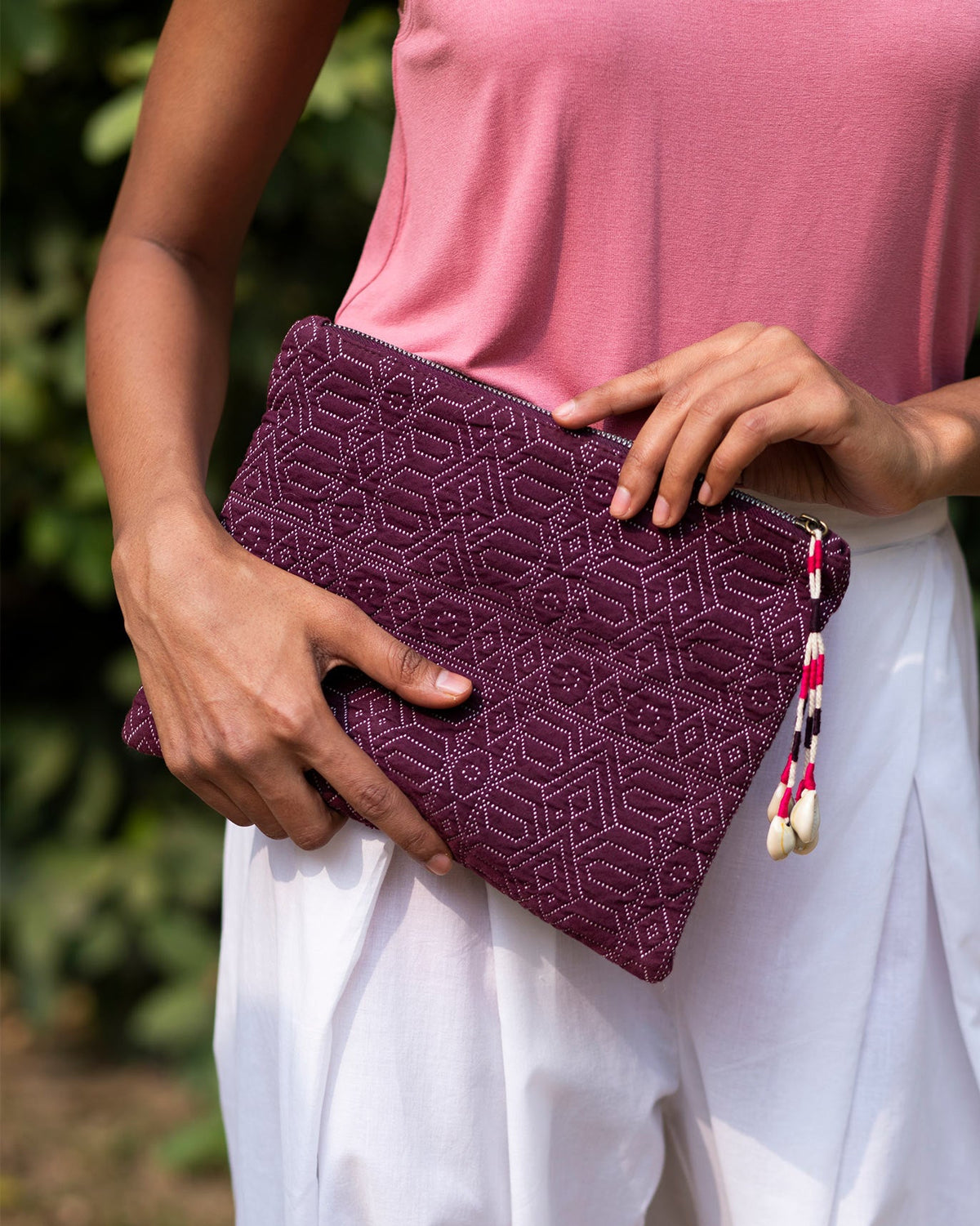 • This pouch comes in a jamun jacquard fabric with a repeating golden geometric pattern