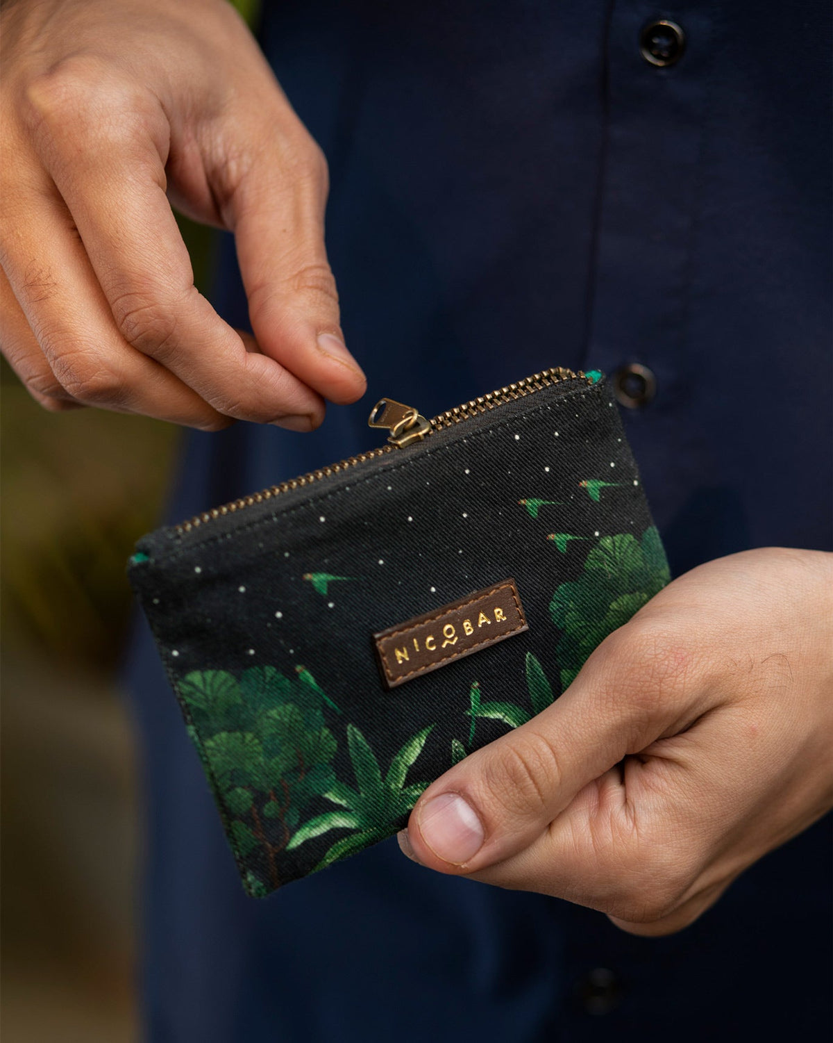 • This pouch comes in a black twill fabric with a tropical Nicobar print