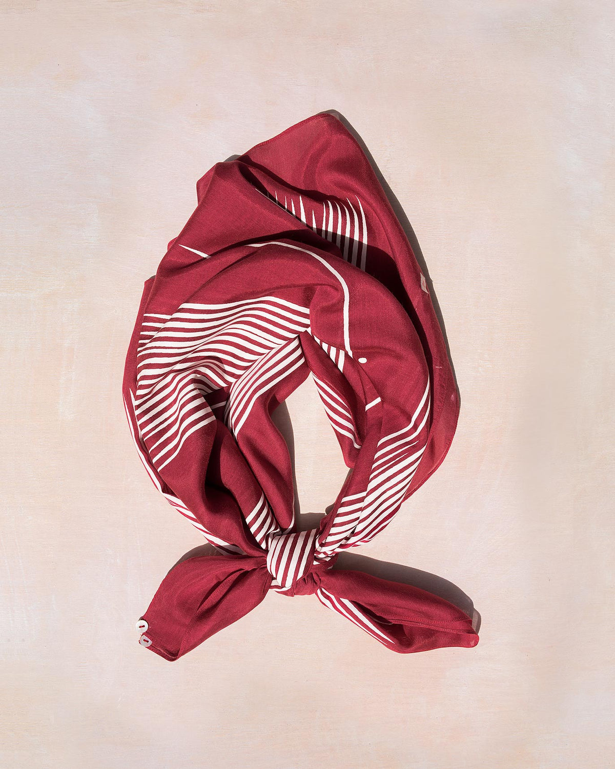 - In soft mulmul, this red and white scarf features an abstract print and four gold buttons along the corners