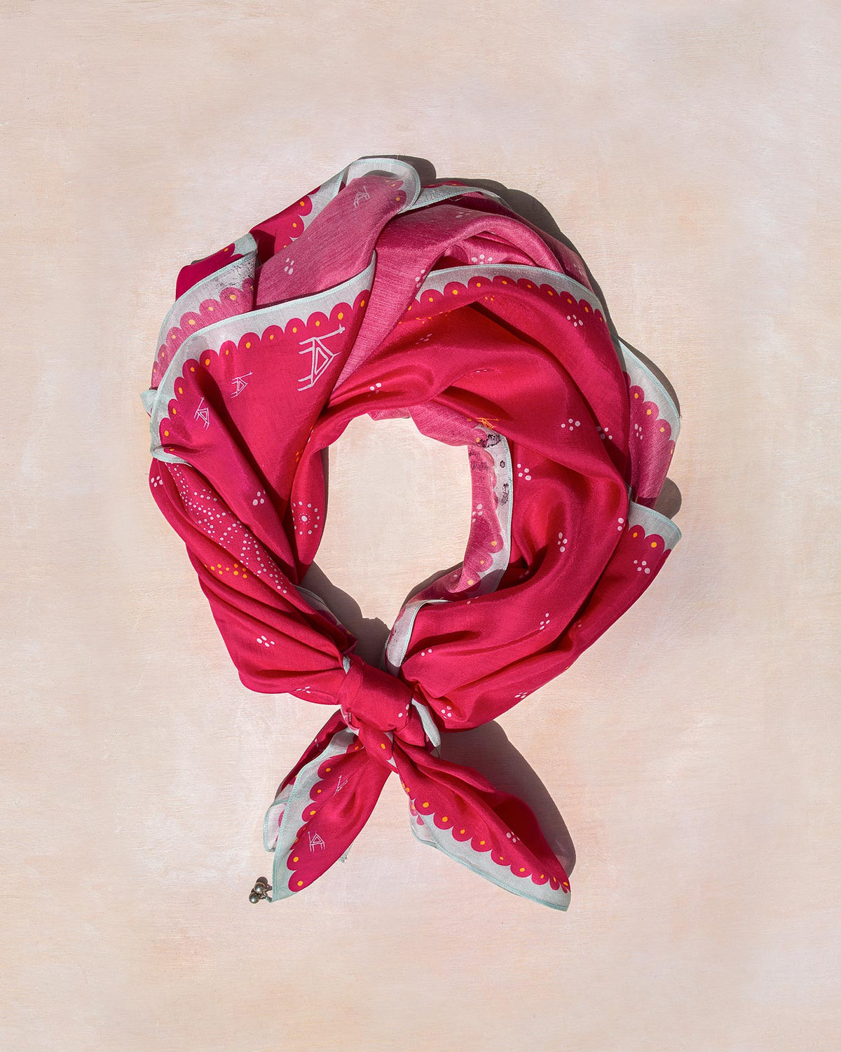 • Inspired by the tattoos worn by the banjaras, this is a pink scarf with a tiny dot print and finished with little bells on two corners