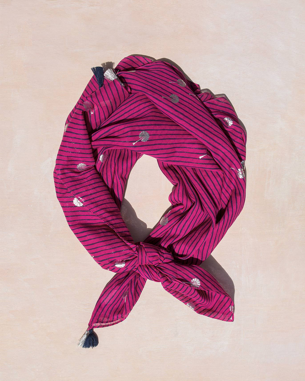 - In soft mulmul, this bright pink scarf has small zari tassels at the four corners and the signature leheriya stripe