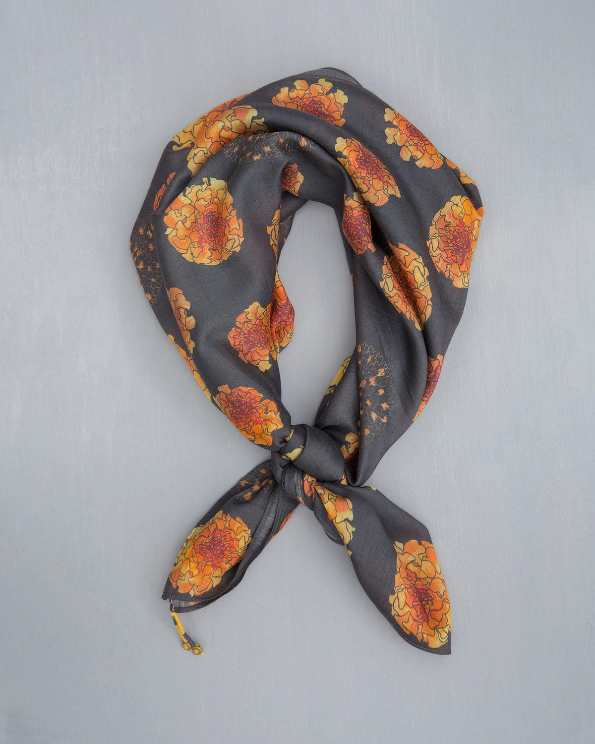 - Perfect for any time of year, this marigold print scarf in silk modal can be worn with dresses, shirts, and kurtas