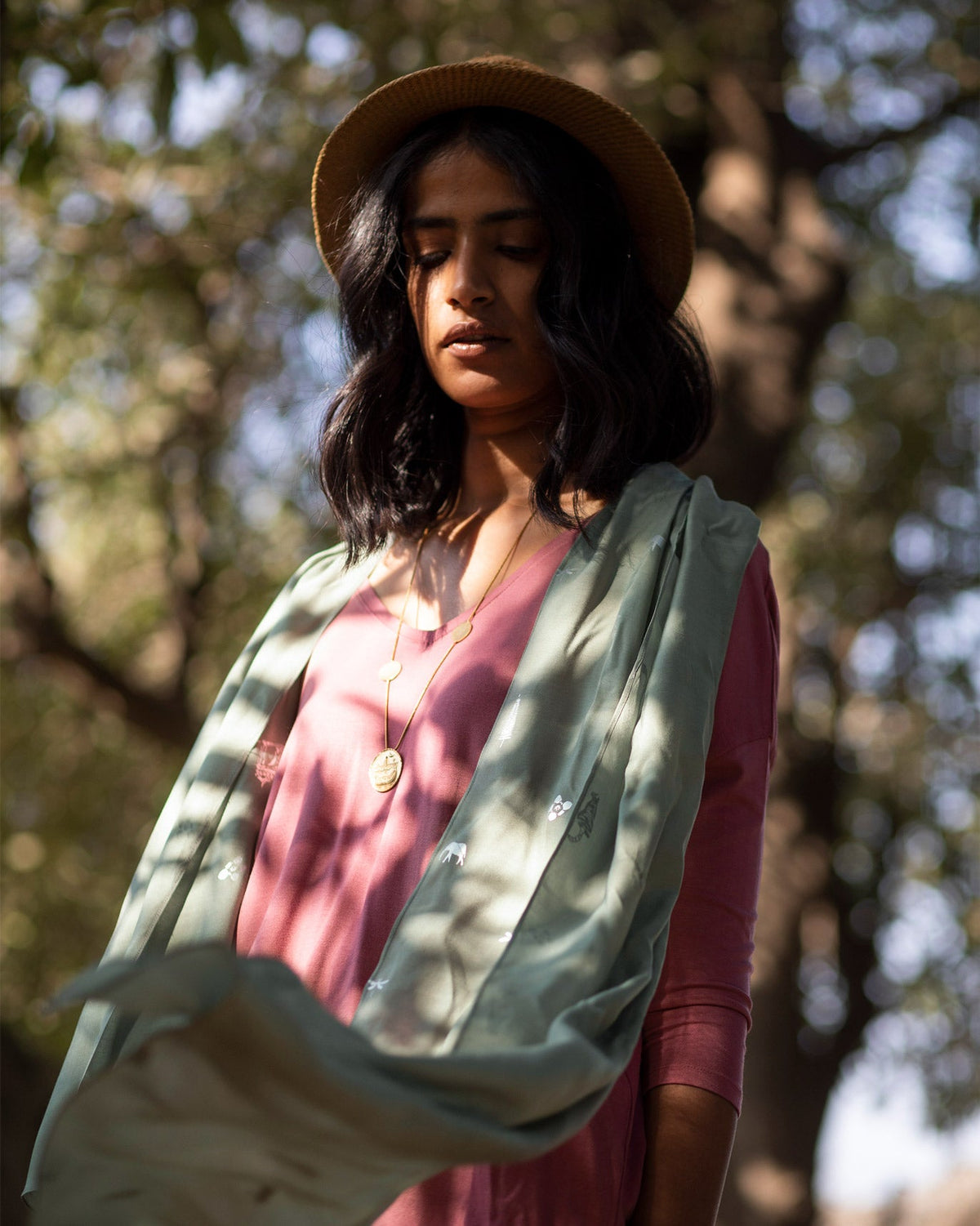 - Crafted in a light olive bemberg fabric, this scarf features a silver foil safari icon print