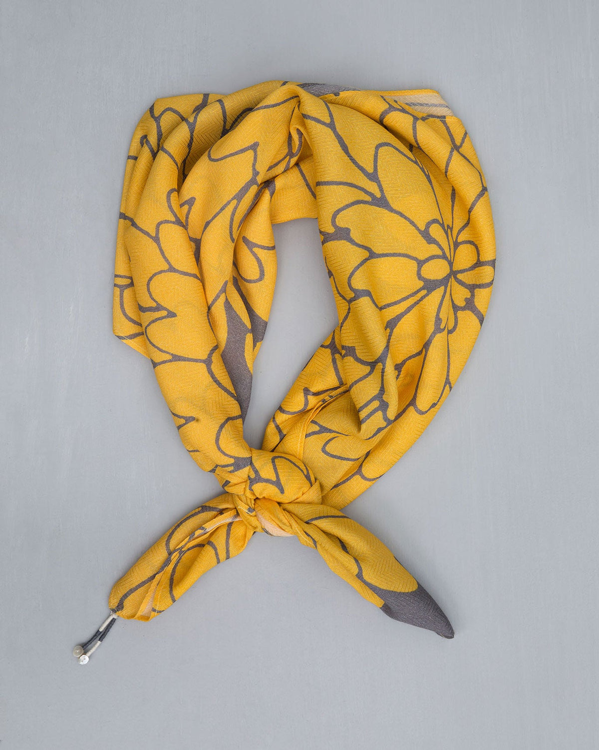 • This bright and bold marigold print on a charcoal base makes for the perfect scarf to wear on a day out or dress up a evening outfit.