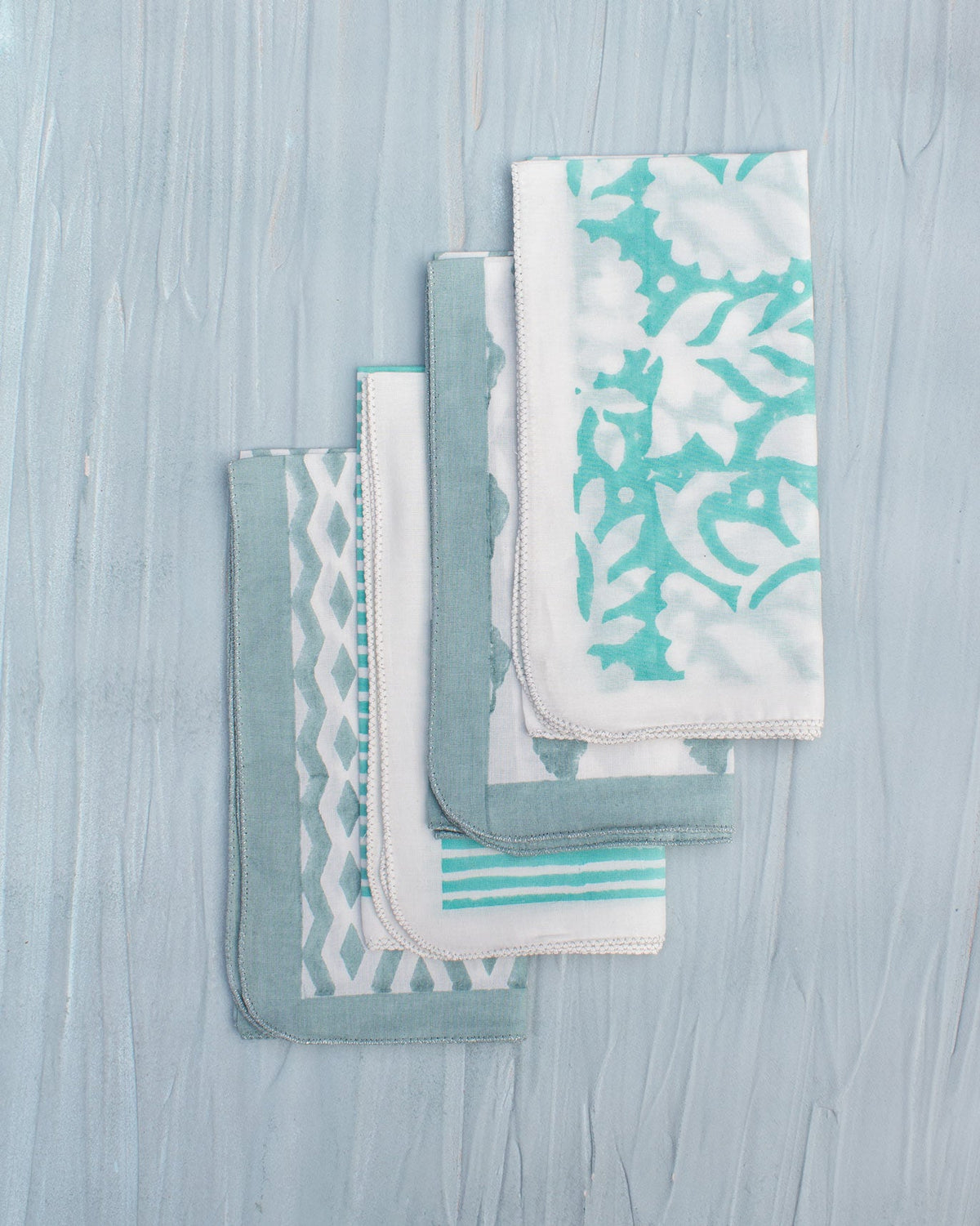 • A set of four hand block printed napkins in fresh aqua and tones of blue that will complement any table setting.
