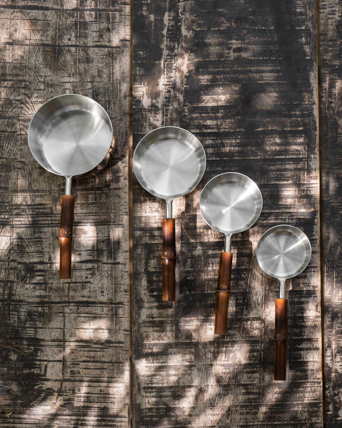- A set of four measuring cups for your kitchen cabinet, crafted in stainless steel with bamboo handles