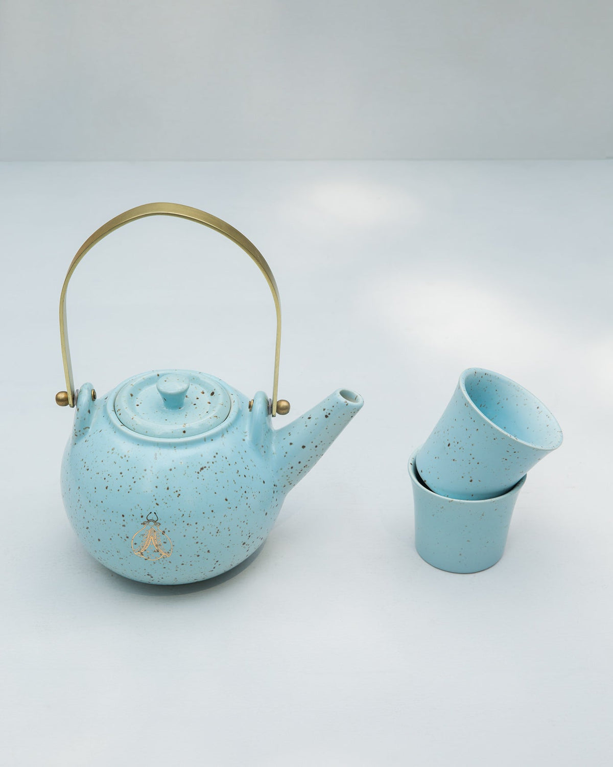 - In a soft powder blue, this speckled stoneware teapot is etched with a simple bug motif and will add a lttle flourish to every table setting.