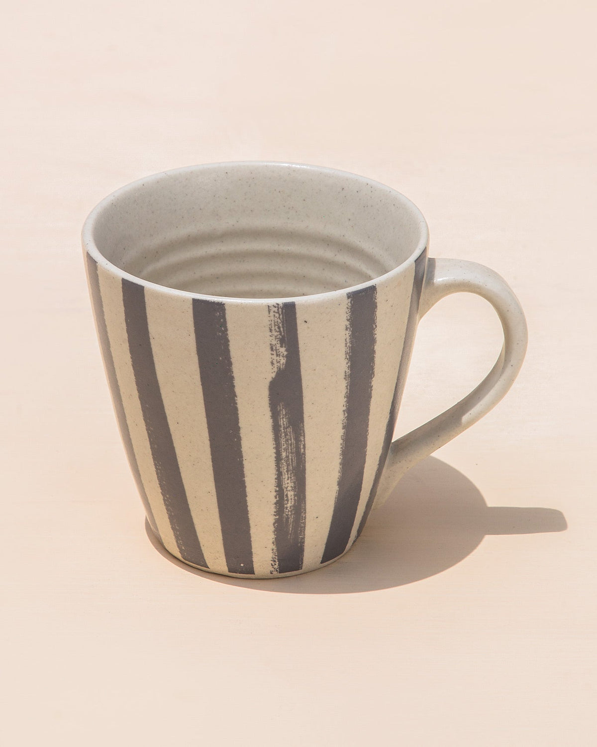 - This mug features classic stripes with a hint of unfinished rawness, all in a monochrome palette of ivory and grey.