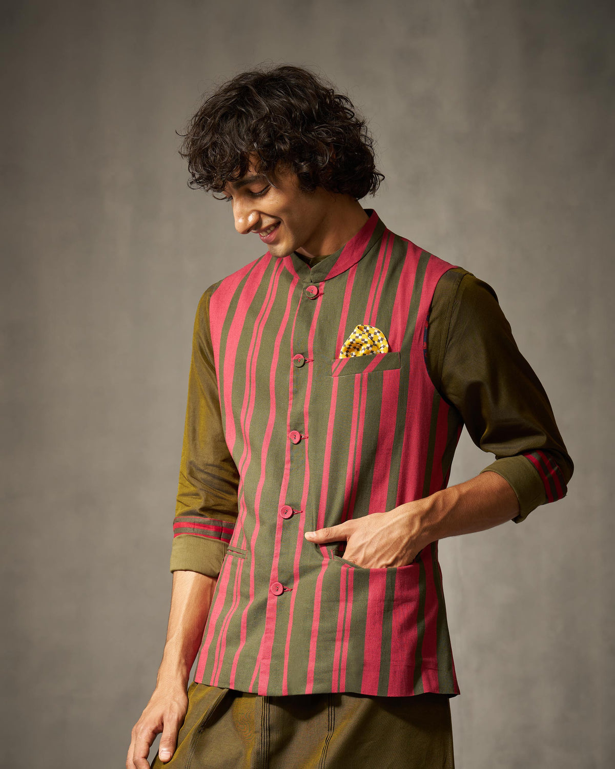 • Our token to tradition in our menswear collection, this Nehru jacket is crafted in comfortable cotton linen and features red and brown stripes, inspired by our travels to Morocco. Stripes are a key element in Moroccan culture, seen in art, architecture, and textiles. Each striped pattern varies in width, color, and arrangement, carrying its own significance.